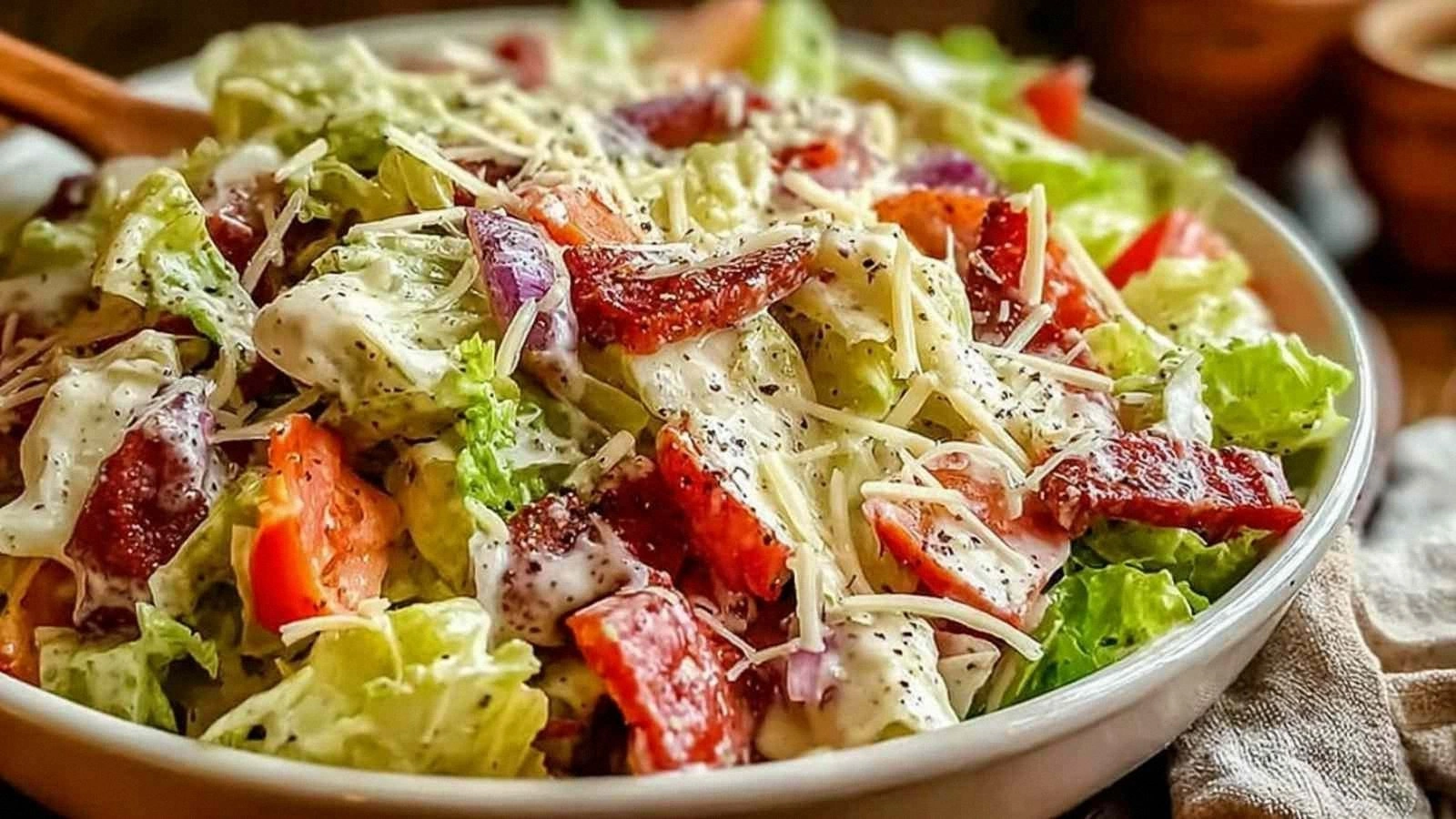 Serve the salad over a bed of quinoa or cauliflower rice for a gluten‑free base. The grains absorb the dressing, adding a subtle nutty flavor that complements the meats and cheeses.