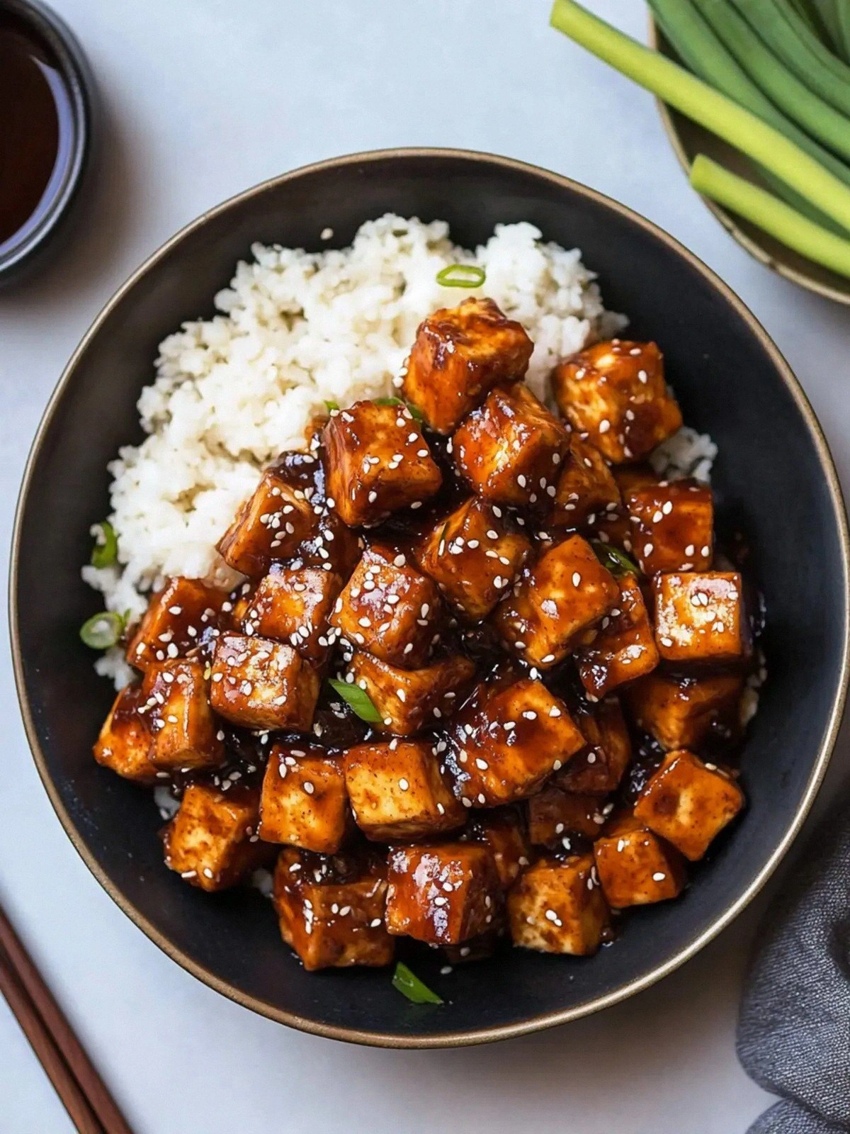 Steamed rice is the perfect canvas for this sauce‑laden tofu, absorbing the flavors while keeping the dish hearty. Toasted sesame seeds add a subtle crunch and nutty flavor that enhances every bite. A drizzle of sesame oil before serving gives the dish a glossy finish and a fragrant aroma that makes the plate look as good as it tastes. Finally, chopped green onions for topping add a fresh, sharp note that balances the richness of the sauce.